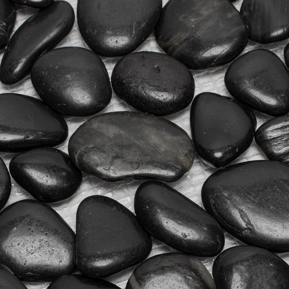 Rain Forest black mid-polished pebble stone floor and wall tiles incorporate smooth beautifully polished mixed pebbles mounted to a flexible mesh backing. Perfect for interior or exterior projects, pebble tiles create a beautiful and unique decorative mosaic look. Add a custom touch to all your floor and wall projects. Tiles are easy to install and use traditional tile grout.