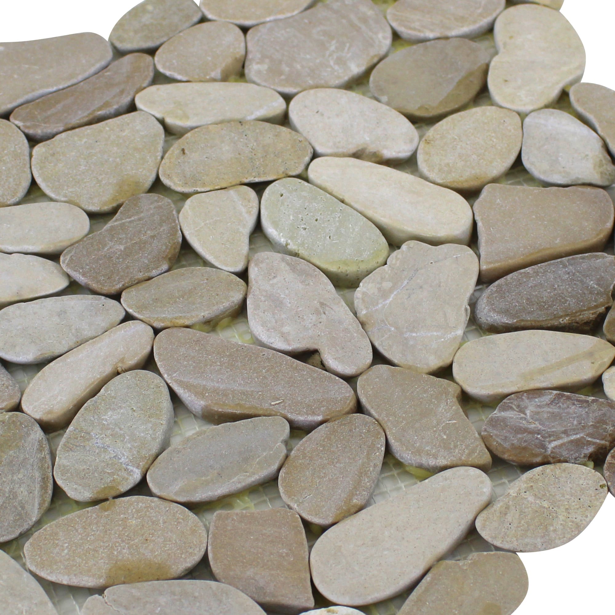 Rain Forest tan honed sliced pebble stone floor and wall tiles incorporate smooth beautifully polished mixed pebbles mounted to a flexible mesh backing. Perfect for interior or exterior projects, pebble tiles create a beautiful and unique decorative mosaic look. Add a custom touch to all your floor and wall projects. Tiles are easy to install and use traditional tile grout.