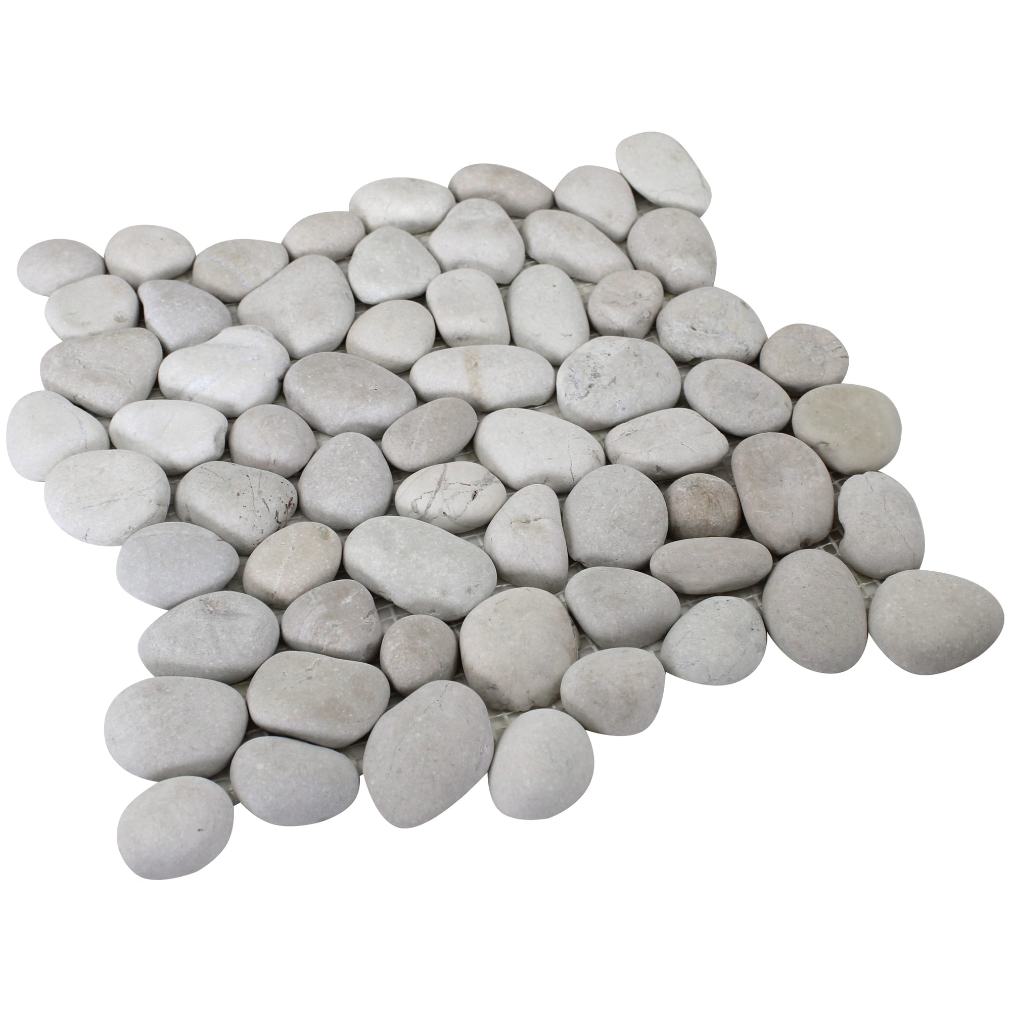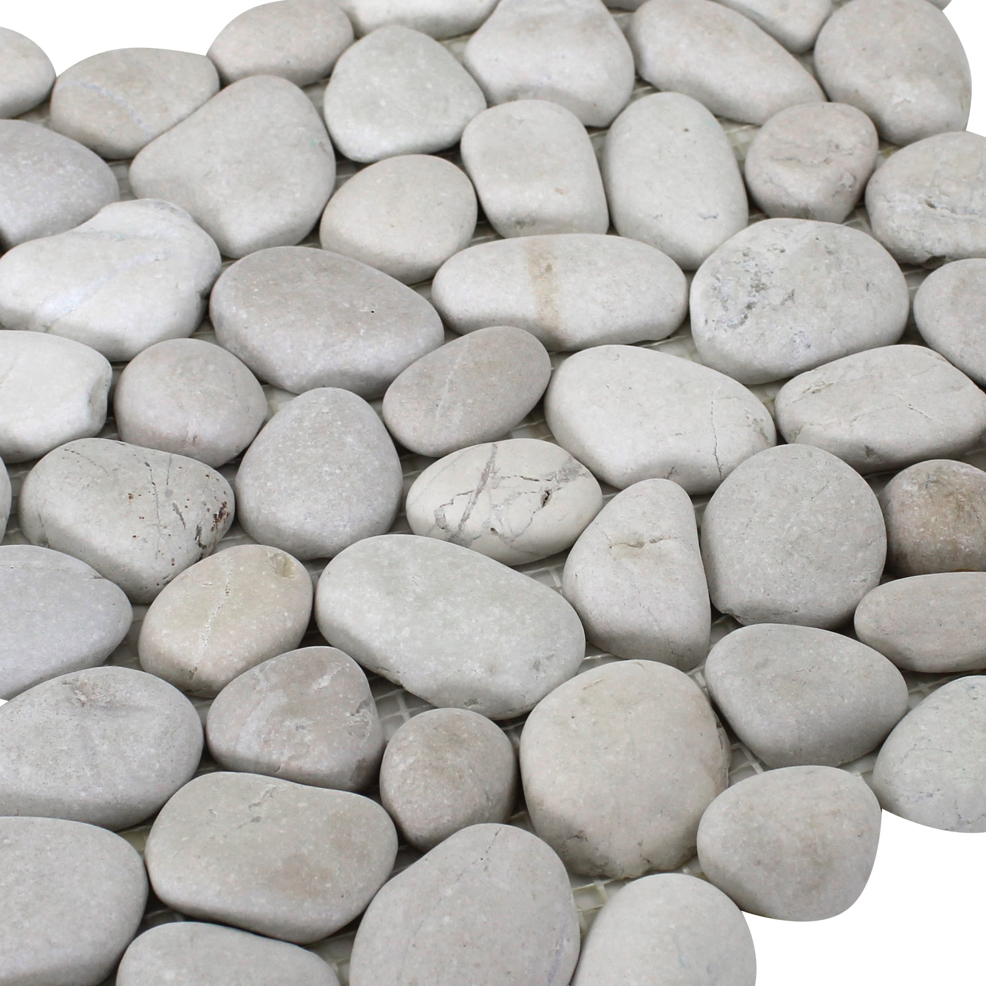 Rain Forest white natural pebble stone floor and wall tiles incorporate smooth beautifully polished mixed pebbles mounted to a flexible mesh backing. Perfect for interior or exterior projects, pebble tiles create a beautiful and unique decorative mosaic look. Add a custom touch to all your floor and wall projects. Tiles are easy to install and use traditional tile grout.